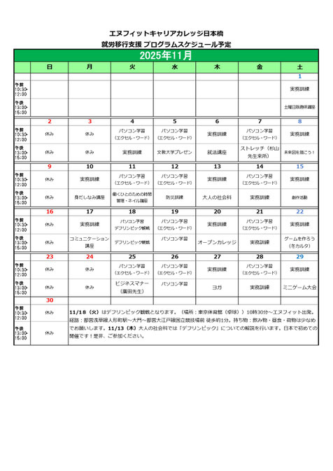 エヌフィットキャリアカレッジ日本橋は、東京都中央区日本橋で、障害を抱える方、メンタルヘルス不調等により生きづらさを感じている方、コミュニケーションがうまくいかないという方へ、社会で働いていくための支援、自立した生活を送っていくための支援を行なっています。