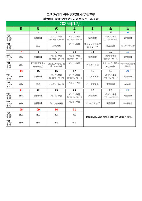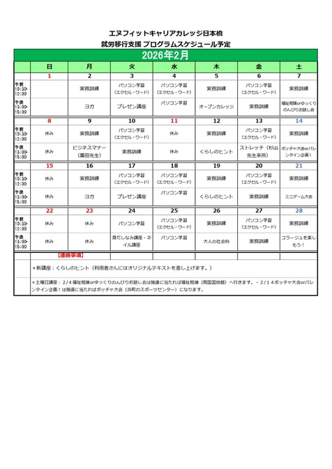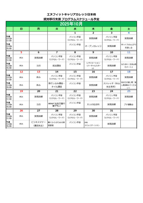 エヌフィットキャリアカレッジ日本橋は、東京都中央区日本橋で、障害を抱える方、メンタルヘルス不調等により生きづらさを感じている方、コミュニケーションがうまくいかないという方へ、社会で働いていくための支援、自立した生活を送っていくための支援を行なっています。